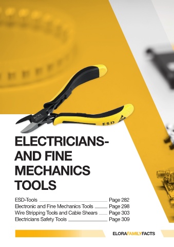 ELECTRICIANS- AND FINE MECHANICS TOOLS ESD-Tools Page 282 Electronic and Fine Mechanics Tools Page 298 Wire Stripping Tools and Cable Shears Page 303 Electricians Safety Tools Page 309 ELORAFAMILYFACTS