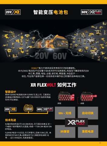 FLEXVOLT电池十分灵活。它们并联时,适用于20V工具,串 XR兼容 重载电源
