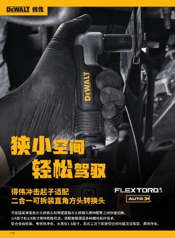 狭小空间 轻松驾驭 得伟冲击起子适配 二合一可拆装直角方头转换头 可在超紧凑直角方头转换头和常规直角方头转换头两种配置之间快速切换。 1/4英寸和3/8英寸两种规格可选,搭配套筒满足多种螺栓起拧需求。 铝合金齿轮箱,有效抗冲击,头宽仅1.5英寸,恶劣工况下和狭窄空间也能灵活驾驭、高效作业。 110