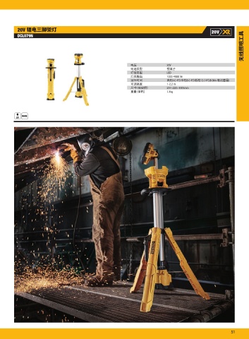 20V 锂电三脚架灯 20 无线照明工具 DCL079N 电压 20V 电池类型 锂离子 灯泡类型 LED 灯光输出 1000-4000 lm 运行时间 高档4小时/中档8小时/低档12小时(6.0Ah 电池容量) 可调高度 1-2.2 m 尺寸(收拢后) 237×220×1005mm 重量(单机) 7.4kg 51