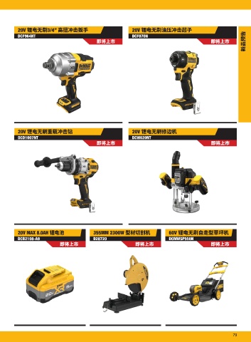 20V 锂电无刷3/4” 高扭冲击扳手 20V 锂电无刷油压冲击起子 新品预告 DCF964NT DCF870N 即将上市 即将上市 20V 锂电无刷重载冲击钻 20V 锂电无刷修边机 DCD1007NT DCW620NT 即将上市 即将上市 20V MAX 8.0AH 锂电池 355MM 2300W 型材切割机 60V 锂电无刷自走型草坪机 DCB2108-A9 D28720 DCMWSP550N 即将上市 即将上市 即将上市 79