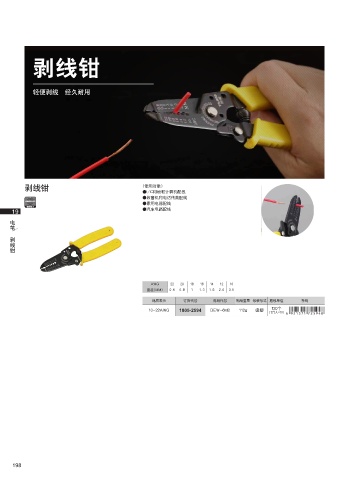 剥线钳 轻便剥线 经久耐用 剥线钳 (使用对象) ●I/C印板和计算机配线 ●收音机和电话传真配线 ●家用电器配线 19 ●汽车电路配线 电笔 剥线钳 \ AWG 22 20 18 16 14 12 10 直径(MM) 0.6 0.8 1 1.3 1.6 2.0 2.6 品质表示 订货代号 商品代号 制品重量 包装形式 捆包单位 条码 10-22AWG 1805-2594 DEW-6M2 112g 吸塑 120个 (12个入×10) 198