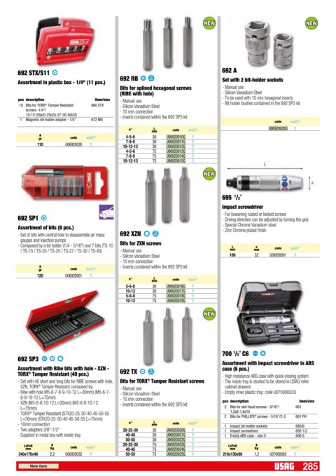 - Set with 40 short and long bits for RIBE screws with hole, Bits for TORX Tamper Resistant screws - The inside tray is studied to be stored in USAG roller