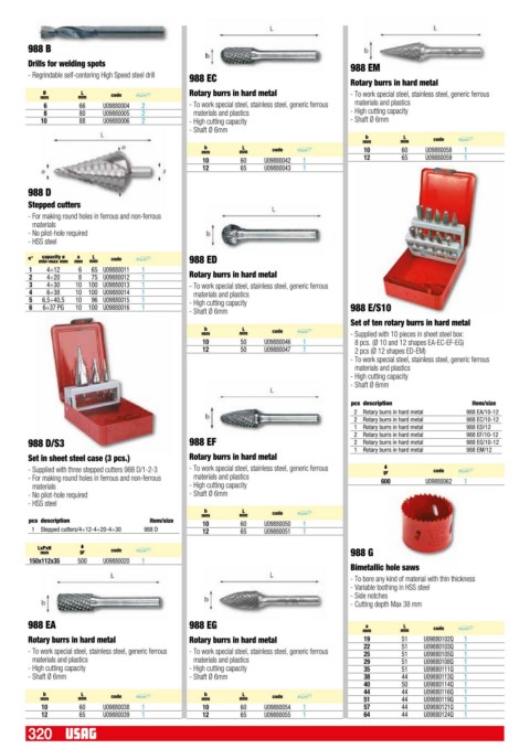 - Supplied with three stepped cutters 988 D/1-2-3 - To work special steel, stainless steel, generic ferrous gr code Q.tà x conf. €