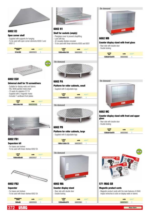 - For bases and shelves - Rear side with double door - Magnetic product cards with the main features of USAG
