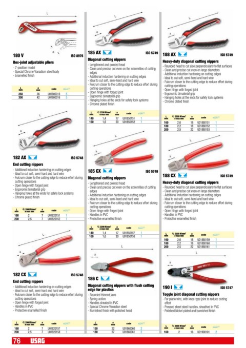 - Additional induction hardening on cutting edges Diagonal cutting nippers with flush cutting 190 I ISO 5747