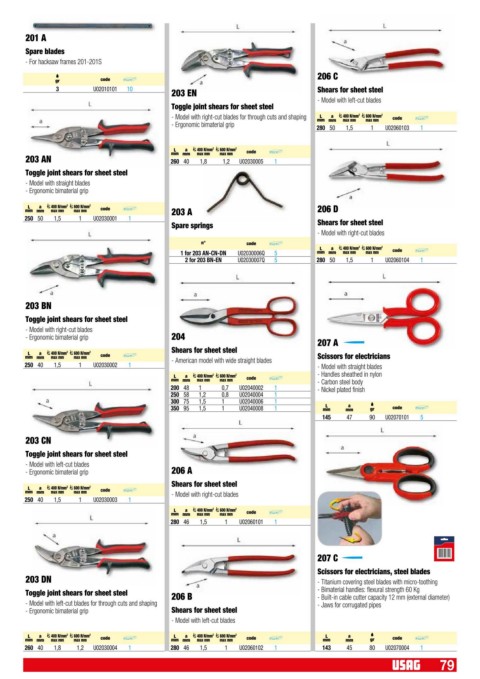 Toggle joint shears for sheet steel 206 B - Bimaterial handles: flexural strength 60 Kg