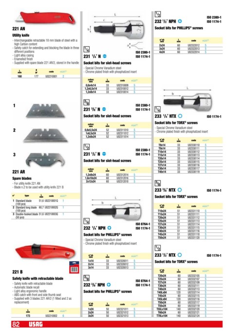 - Supplied with spare blade 221 AR/2, stored in the handle Socket bits for slot-head screws