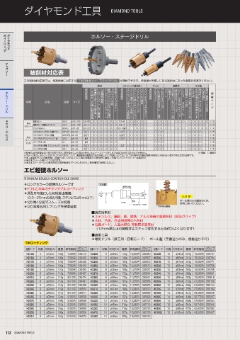 この被削材対応表では、各被削材に対応する エビ印・ホルソー・ステージドリル が選択できます。お客様がお使いになる被削材にあった商品をお選びください。